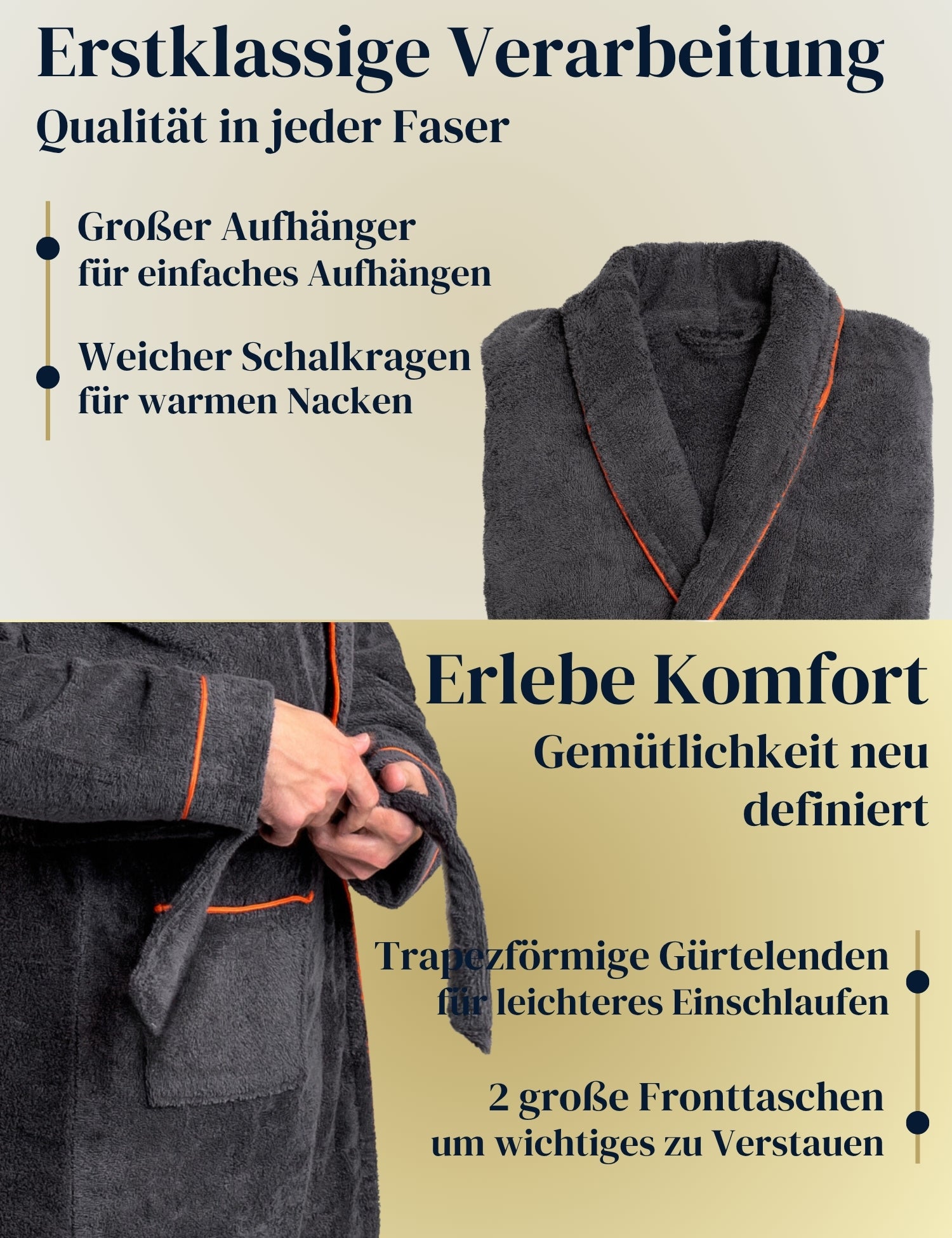 Ob als Sauna Bademantel, Hausmantel, Morgenmantel oder Tagesmantel – unser schöner Bademantel für Männer in anthrazit/grau ist stilvoll und ganzjährig einsatzbereit: atmungsaktiv für wärme Tage und an kühleren Tagen spendet er angenehme Wärme. Gönne Dir einen Moment der Entspannung und lassen Dich von unserem Herren Bademantel verwöhnen. Dein neuer flauschiger Lieblingsbegleiter für wohlige Augenblicke!